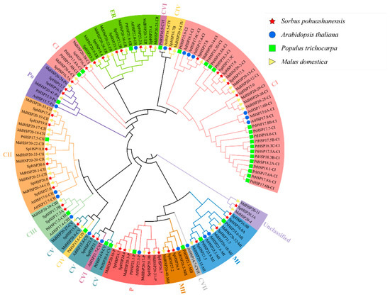 The sequences of HSP20s in S. pohuashanensis, Populus trichocarpa, A. thaliana, and Malus domestica (Malus domestica) were aligned using MEGA7.0, and they were then used to construct a phylogenetic tree with the neighbor-joining (NJ) method. The constructed phylogenetic tree was evaluated using the bootstrap method (repeated 1000 times). In addition, the Phylogenetic tree was visualized via the online tool iTOL (http://itol.embl.de/ (accessed on 11 April 2022)).
