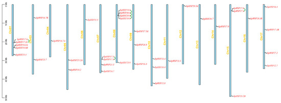 Based on the annotation file of the S. pohuashanensis genome, the chromosomal positions of SpHSP20 genes were located using TBtools (Figure 3). It was found that 38 SpHSP20 genes were unevenly distributed on 16 chromosomes of S. pohuashanensis (except Chr02), among which Chr01 and Chr08 contain the most SpHSP20 genes (five); Chr07 and Chr17 each have four SpHSP20s; Chr09, Chr10, and Chr15 each have three SpHSP20s; Chr02 and Chr04 have two SpHSP20s; the remaining seven SpHSP20s are distributed on the other seven chromosomes. Moreover, we detected gene duplication events using MCScanX and obtained genome-wide tandem and segmental duplicated gene pairs (Table S4). The TBtools software was used to visualize the syntenic analysis results of the SpHSP20 gene family. The results show that six pairs of SpHSP20 genes were regarded as tandemly duplicated genes located on Chr01, Chr07, Chr08, and Chr15 (Figure 3, Table S4). In addition, except for 13 genes (SpHSP16.0B, SpHSP16.4, SpHSP17.0, SpHSP17.3C, SpHSP17.8, SpHSP18.0, SpHSP20.3A, SpHSP24.4, SpHSP24.7, SpHSP26.0, SpHSP27.0, SpHSP30.6, and SpHSP31.0), the SpHSP20 genes had 28 segmental duplication gene pairs (Figure 4, Table S4). These results indicated that tandem and segmental duplications promoted the formation of the SpHSP20 gene family to different degrees.