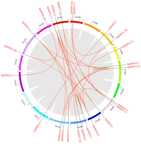 Syntenic relationships of the SpHSP20 genes. Grey lines indicate all homologous blocks in the Sorbus pohuashanensis genome, and the red and green lines indicate segmental duplicated SpHSP20 gene pairs on the same and different chromosomes. The segmental duplicated gene pairs are listed in Table S4.
