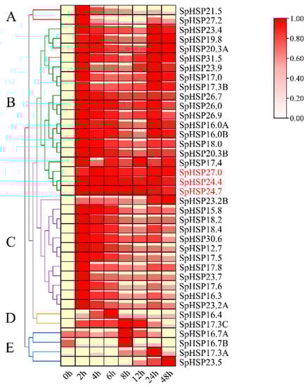 We downloaded previous transcriptome data (Bioproject ID: PRJNA716887) from the NCBI SRA (Sequence Read Archive) database to evaluate the expression pattern of SpHSP20s under natural high temperature stress using FPKM (fragments per kilobase of transcript per million fragments mapped) values. Compared with the control, almost all SpHSP20s were upregulated after high temperature stress, and the expression level of most SpHSP20s reached the highest within a short time, while some SpHSP20s showed multiple expression peaks during the stress process (Figure S2). In addition, the sample environmental data for transcriptome sequencing were provided in Table S7. A heatmap of 38 SpHSP20 genes was constructed using relative expression values to evaluate their expression levels under heat stress (Figure 7, Table S8). Compared with those at 0 h of treatment, after heat stress treatment at 42 °C, all SpHSP20s were upregulated to different degrees. The heatmap shows that the 38 SpHSP20 genes clustered into five groups, with most SpHSP20s (79%) belonging to clusters B and C. The expression levels of clusters A, B, and C all peaked at 2 h, and then the expression levels of cluster A (SpHSP21.5 and SpHSP27.2) began to decline, whereas the expression levels of clusters B and C decreased at 8–12 h. The expression levels of clusters A, B, and C increased again after 24 h and the expression levels of cluster B at 24 h were similar to those at 2 h. The expression of cluster D reached its peak at 6–8 h, and then gradually decreased. Interestingly, the expression of cluster E (SpHSP16.7A, SpHSP16.7B, SpHSP17.3A, and SpHSP23.5) was downregulated at 2 h, and then it began to increase, gradually reaching its peak after 8 h. Meanwhile, the expression levels of SpHSP24.4, SpHSP24.7, and SpHSP27.0 in cluster B were consistently high during the entire heat stress process, suggesting that these three genes may be important in the response of S. pohuashanensis to heat stress. The experimental results were basically consistent with the transcriptome data.