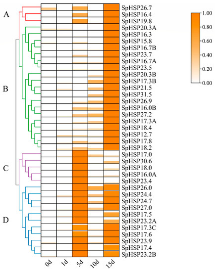 The heatmap shows the expression patterns of 38 SpHSP20 genes under salt stress clustered into four groups (Figure 8, Table S8). Clusters A, B, C, and D contained 3, 19, 5, and 11 SpHSP20s, respectively. The expression of clusters A and B reached a peak at 15 d, and, compared with cluster B, the expression of cluster A also increased significantly at 5 d. The expression of cluster C tended to increase first and then decrease, reaching a peak at 5 d. The expression level of cluster D showed a trend of increased → decreased → increased; it reached the peak at 5 d, decreased significantly at 10 d, and then was upregulated at 15 d. In conclusion, the SpHSP20 gene family showed a diverse expression trend during different periods of salt stress.