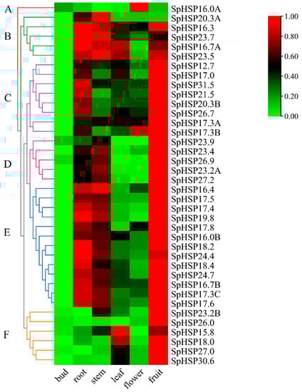 The expression patterns of SpHSP20s in different organs. The different colors represent the level of expression of each gene in each sample. Different patterns of expression are represented by branches of different colors and are numbered A–F. Spβ-actin is used as an internal control. qRT-PCR data are shown relative to the buds. The relative expression levels were calculated using the 2−ΔΔCT method and normalized using log2.