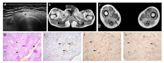 - Mercier, S.; Magot, A.; Caillon, F.; Isidor, B.; David, A.; Ferrer, X.; Vital, A.; Coquet, M.; Penttilä, S.; Udd, B.; et al. Muscle Magnetic Resonance Imaging Abnormalities in X-Linked Myopathy with Excessive Autophagy. Muscle Nerve 2015, 52, 673–680. [Google Scholar] [CrossRef] [PubMed]