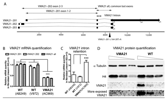 VMA21 causative variant and mRNA- and protein-level quantification. (A). Schematic representation of VMA21 transcripts (Ensembl database). Squares represent exons, lines represent introns, and block arrows represent the polyadenylation site and it alternative sites (pA). Primers are represented by arrows. Primer pairs VMA21–201 exon1-2 and VMA21–202 exon1-2 specifically amplify each corresponding isoform, whereas the primer pair VMA21 exon2-3 amplifies all three isoforms. The mutation c.164-20T>A affecting isoform 1 (VMA21–201 or NM_001017980.4 or ENST00000330374.7) located in the last intron is represented by a black triangle. (B). VMA21 mRNA quantification via qRT-PCR on wild-type control fibroblasts (line AB249 and line V972) compared to fibroblasts derived from the case-report patient (line AC969). The primer pairs illustrated in (A) were used. For all three primer pairs used, the levels of VMA21 mRNA were significantly lower in line AC969 compared to the wild-type control cell lines. Two-way ANOVA test. *** p < 0.0001 (C). VMA21 intron retention quantification via RT-PCR on wild-type control fibroblasts (line AB249 and line V972) compared to fibroblasts derived from the case-report patient (line AC969). The levels of intron retention in VMA21 mRNA were significantly higher in the cell line AC969 compared to the wild-type control cell lines. One-way ANOVA test. *** p < 0.001 (D). VMA21 protein quantification via Western Blot on AC969 fibroblasts versus wild-type control fibroblasts (line V971). Three concentrations (4×, 2×, and 1×) of protein extract were loaded for each line. α-tubulin and histone H4 were revealed and used as loading control. VMA21 antibody detected a clear signal in the wild-type cell line.