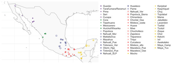 Geographical distribution of the 53 Mexican Indigenous communities included. Dot shapes denote the ethnic group and colors their assigned geographic region. Purple: North, green: Northwest, blue: Center, red: South, and yellow: Southeast.