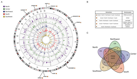 Overall, we found different candidate genes under selection in each geographic region, ranging from 78 in the South to 163 in the North (Figure 2; Tables S2–S6). Several are related to the metabolic processes and immune response (Tables S2–S6), although each region exhibited its own local adaptation profile (Figure 2A). In general, we observed that the populations from adjacent regions share more local adaptation signals than those from distant regions (Figure 2B, Table S7), in line with previous observations regarding the genetic relationships between Indigenous populations from different geographic locations [8,9,12]. For example, the South shared 57 candidate genes with the Southeast but only 7 with the North (Figure 2C, Table S7). Interestingly, only two genes showed significant adaptation signals in all the tested regions. These genes were peroxisome proliferator-activated receptor γ (PPARG) and adherens junctions–associated protein 1 (AJAP1) (Figure 2B, Table S7).