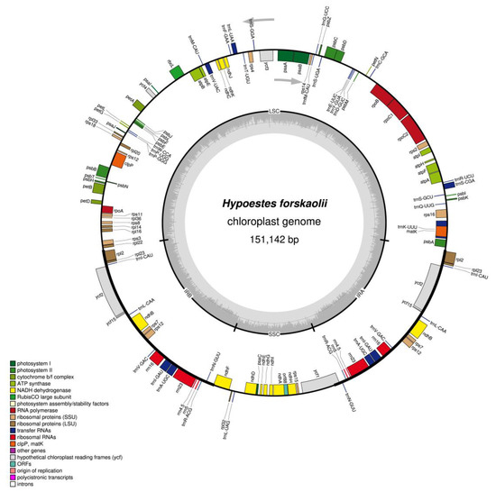 Yaradua, S.S.; Yessoufou, K. The Complete Chloroplast Genome of Hypoestes forskaolii (Vahl) R.Br: Insights into Comparative and Phylogenetic Analyses within the Tribe Justiceae. Genes 2022, 13, 2259. https://doi.org/10.3390/genes13122259