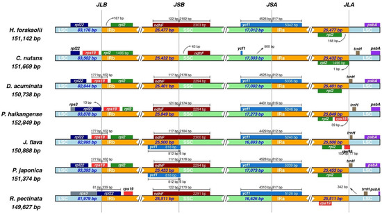 - Chen, H.; Shao, J.; Zhang, H.; Jiang, M.; Huang, L.; Zhang, Z.; Yang, D.; He, M.; Ronaghi, M.; Luo, X.; et al. Sequencing and analysis of Strobilanthes cusia (Nees) Kuntze chloroplast Genome revealed the rare simultaneous contraction and expansion of the inverted repeat region in Angiosperm. Front. Plant Sci. 2018, 9, 324. [Google Scholar] [CrossRef]