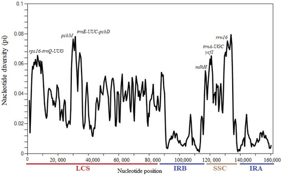 - Dong, W.P.; Liu, J.; Yu, J.; Wang, L.; Zhou, S.L. Highly variable chloroplast markers for evaluating plant phylogeny at low taxonomic levels and for DNA barcoding. PLoS ONE 2012, 7, e35071. [Google Scholar] [CrossRef] [PubMed]