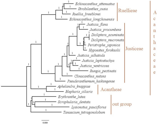 - McDade, L.A.; Daniel, T.F.; Masta, S.E.; Riley, K.M. Phylogenetic relationships within the tribe Justicieae (Acanthaceae): Evidence from molecular sequences, morphology, and cytology. Ann. Missouri Bot. Gard. 2000, 87, 435–458. [Google Scholar] [CrossRef]