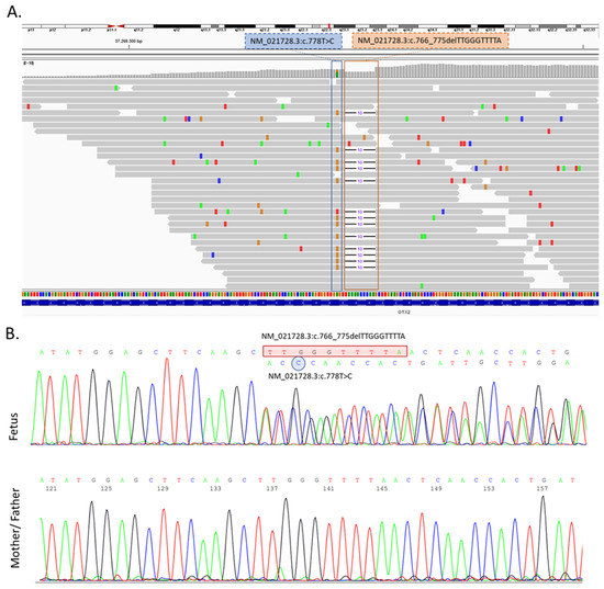 (A) Visualization of the result of the clinical exome sequencing (CES) showing the identified variant in the OTX2 gene by Integrative Genomics Viewer (IGV) software (https://software.broadinstitute.org/software/igv/ accessed on 1 August 2022). c.778T>C and c.766_775delTTGGGTTTTA variants were in a heterozygous status in the proband. (B) Sanger sequencing confirmed the identified OTX2 variants, which were not present in his parents.