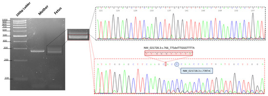 Gel image showing the PCR products of exon 5 of the OTX2 gene. The resultant PCR products using DNA from a control (in this case the mother of fetus), showed a single amplified DNA fragment of 290 bp, as expected of a normal allele, whereas the proband showed two bands comprising an aberrant band (280 bp), that was smaller than that of the mother. Sanger sequencing shows the two different alleles in the proband, highlighting the presence in cis of the two identified variants in the OTX2 gene.