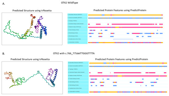 (A) Predicted structure and protein features of the wild type OTX2 protein. (B) Predicted structure and protein features of the frameshift variant Leu256ThrfsTer43 on the OTX2 protein. Predicted structure was obtained using the trRosetta tool (https://yanglab.nankai.edu.cn/trRosetta/ access on 15 November 2022), instead the predicted protein features were calculated using the PredictProtein tool (https://predictprotein.org/ access on 15 November 2022).