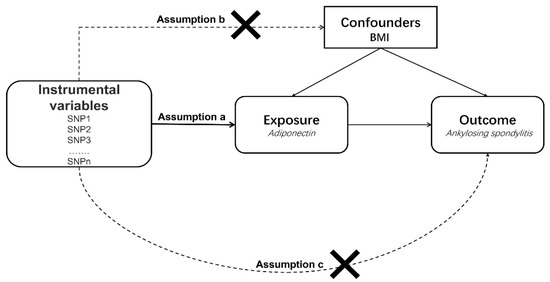 Adiponectin is the most abundant adipokine secreted by adipocytes in human plasma [11]. It participates in multiple physiological activities, such as enhancing insulin sensitivity and promoting anti-inflammatory/antifibrotic abilities [12]. Of note, recent studies have suggested that adiponectin has proinflammatory effects in patients with autoimmune diseases [13,14,15]. The evidence on the relationship between circulating adiponectin (CA) levels and AS is currently inconclusive. A study has shown that reduced high-molecular-weight adiponectin levels are associated with new bone formation in AS [16]. Others found significantly elevated serum adiponectin levels in patients with AS compared with healthy individuals [17]. However, previous meta-analyses have indicated that CA levels were not significantly different between patients with AS and controls [18,19]. The causal relevance between CA levels and AS risk has not yet been established. Therefore, exploring the causality between the two has crucial implications.