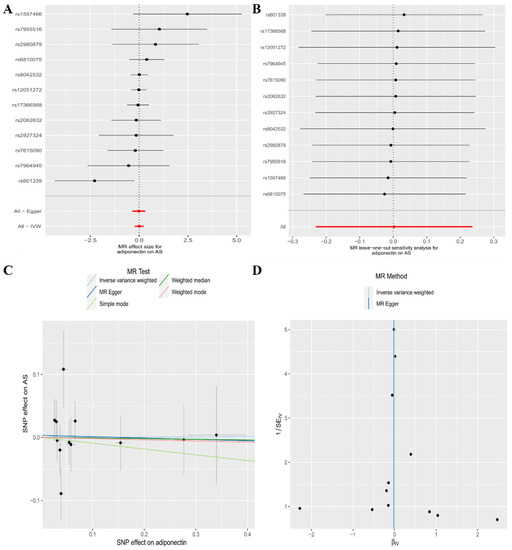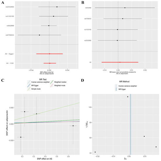 The association between the risk of ankylosing spondylitis and circulating adiponectin levels is presented in (A) a forest plot, (B) a leave-one-out sensitivity analysis, (C) a scatter plot, and (D) a funnel plot.