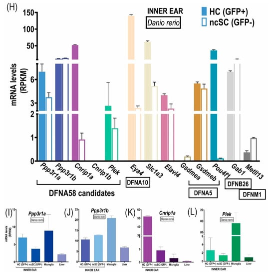 A reanalysis of zebrafish transcriptome data (RNA-seq) was performed regarding the DFNA58 genes’ expression and the same control/reference genes, obtained from three different studies (Supplementary Table S5, Figure 2H–L).