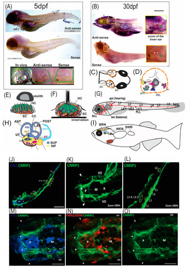 Figure 3. Expression and localization analysis of Cnrip1 in the zebrafish. In (A,B) zebrafish in situ hybridization results in a lateral section of specimens with 5 dpf and 30 dpf, respectively. The telencephalon and forebrain (*) and midbrain (M) and hindbrain (H) brain regions, and heart (HRT) are indicated. The area delimited in yellow dotted in the larger figure and zoomed in on the smaller figure, refers to the otic vesicle (OV) in (A) and IE in (B). In both figures, at zoom (5X magnification) the OV dotted in green is shown; in red, the semicircular canals; yellow arrow: posterior saccular otolith; black arrow: utricular anterior otolith; white arrows: position of the semicircular canals. Scale bar: 500 μm (5 dpf) and 100 μm (30 dpf). (CI) Schematic representation of the auditory sensory organ of zebrafish in larval (OV) and adult (IE) stage 5, as well as line lateral (LL) and its neuromasts. (C) Dorsal view of the head region with eyes in black. The OV and the anterior (CA) and posterior (PC) canals are represented by the black outlines; dotted orange line: the medial wall of developing otocyst; gray: otoliths. (D) Representation of the OV of a larva and the epithelial structures around which the semicircular canals are formed. (E) Cross section of IE neuroepithelium (anterior macula): HCs in green, SCs in orange, and the apical part of the epithelium is bathed by endolymph. (F) Longitudinal diagram of a neuromast showing the different cell types that compose it, quite similar to the IE. (G) Schematic representation of a larva with the location of the anterior (ALL) and posterior (PLL) LL; orange/green: arrangement of neuromasts; red: ganglia that receive the innervations from the neuromasts of each LL. (H) Representation of the IE of adult zebrafish. (I) Side view of an adult zebrafish. The schematic representations in the figures were designed/drawn taking as models/references the illustrations from [9,53,54,55,56]. (JL) Immunofluorescence of a zebrafish specimen (4 dpf) with anti-cnrip1 labeled in green and cell nucleus in blue (DAPI). (J) Top/front view of the full extent of the specimen. Scale bar: 500 μm. (K) Zoom (200 x) of the head region. Highlighted are the brain regions M, P, and R, the OV, and the olfactory bulb (white star). (L) Zoom (200 x) of the final portion of the tail, highlighting LLP and its neuromasts (yellow circles). (MO) Superior dorsal view of the head. In red, we have the phalloidin labeling showing the actin filaments. White arrow: eyes. Scale bar: 100 μm. Images were analyzed with a Zeiss LSM 780 confocal microscope and captured with ZEN software. VO: otic vesicle; LL: lateral line; BRN: brain; WEB: Weber’s ossicles; IE: inner ear; SWB: swim bladder; HRT: heart; MA: anterior macula; LAG: Lagena; UT: utricle; SAC: saccule; SAG: statoacoustic ganglion; mc: medial crest; Cp: mc posterior crest; pm: posterior macula; ANT: anterior semicircular canal; POST: posterior semicircular canal; CC: central semicircular canal; LAT: lateral semicircular canal; SUP: upper pars; INF: lower pars.