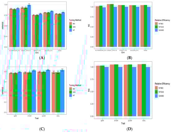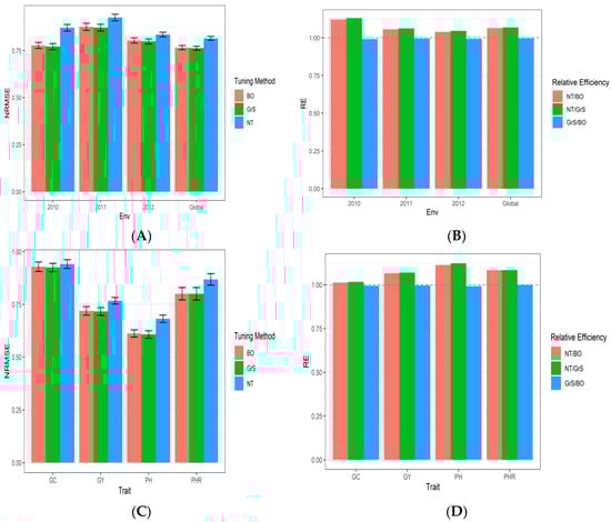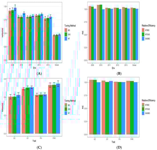 In Figure 1C (Table A1), the prediction performance is provided for each trait across environments, while in Figure 1D the relative efficiencies of comparing NT versus BO, NT versus GrS, and GrS and BO, are provided and show that in all traits, the best strategies for tuning in terms of NRMSE are the BO and GrS method without relevant differences between the GrS and BO method.