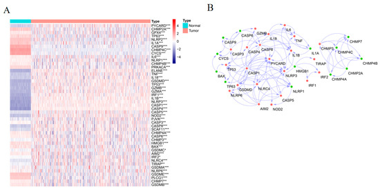 Expressions of the 52 pyroptosis-related genes in AML. (A) DEGs Heatmap of the pyroptosis-related genes in the normal (Normal, cyan) and the tumor tissues (Tumor, pink) (purple: low expression level; red: high expression level). p values were shown as: * p < 0.05; ** p < 0.01; *** p < 0.001. (B) PPI network indicated the interactions of the DEGs (interaction score = 0.9) (red: upregulated; green: downregulated; arrow: interaction).