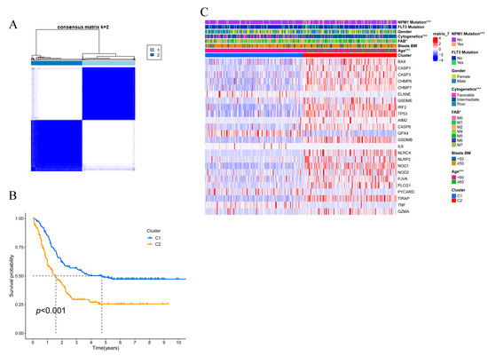 AML clustering based on the differentially expressed pyroptosis-related genes. (A) All AML patients with available survival data from the TCGA-TARGET cohort were divided into two clusters according to the consensus clustering matrix (k = 2). (B) Kaplan–Meier overall survival curves of the two clusters. C1, Cluster1; C2, Cluster2. (C) Heatmap and clinical features of the two clusters. * p < 0.05; *** p < 0.001.