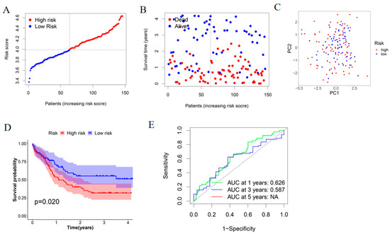 A total of 146 AML patients with survival data from a GEO cohort (GSE147515) were employed as the external validation set. According to the median risk score calculated in the TCGA-TARGET AML cohort, 82 patients in the GEO cohort were allotted into the high-risk group, while the other 64 patients were allotted into the low-risk group (Figure 4A). Consistent with the TCGA-TARGET cohort, with increasing risk score, more dead patients were found (Figure 4B). PCA analysis demonstrated satisfactory separation between the two groups (Figure 4C). Kaplan-Meier survival analysis also showed significant differences between the two groups (p = 0.020, Figure 4D). Time-dependent ROC analysis of the GEO cohort indicated that the prognostic model had a good predictive efficacy (AUC = 0.626 for 1-year, 0.587 for 3-year) (Figure 4E).