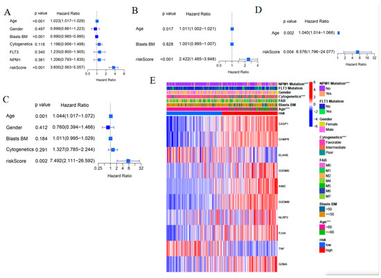 Univariate and multivariate Cox regression analyses of the risk score and clinical features. (A,C) Univariate analysis of the TCGA-TARGET cohort (A) and GEO cohort (C) (Cytogenetics: favorable, intermediate, poor; Blasts BM: blasts percentage in the bone marrow). (B,D) Multivariate analysis of the TCGA-TARGET cohort (C) and the GEO cohort (D). (E) Heatmap (blue: low expression; red: high expression) of clinical characteristics in the TCGA-TARGET cohort between the high-risk and low-risk groups (*** p < 0.001).