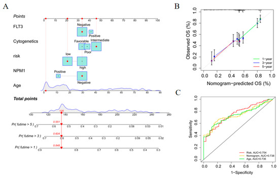 Construction and evaluation of the nomogram of AML patients in the TCGA-TARGET cohort. (A) The nomogram for predicting the probability of patient survival with risk groups and clinical features. (B) The calibration diagram of the nomogram for the observed overall survival (OS) probability and predicted OS at 1-year, 3-year, and 5-year intervals. (C) ROC curve analyses of the nomogram.