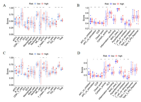 Comparison of the ssGSEA scores of immune cells and immune pathways for two subgroups in both the TCGA-TARGET and GEO cohorts. (A,B) Enrichment scores of 16 types of immune cells (A) and 13 immune-related pathways (B) between low- (green box) and high-risk (red box) group in the TCGA cohort. (C,D) Enrichment scores of 16 types of immune cells (C) and 13 immune-related pathways (D) between low- (green box) and high-risk (red box) group in the GEO cohort. * p < 0.05; ** p < 0.01; *** p < 0.001.