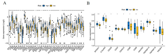 Based on the results of functional analyses, single-sample gene set enrichment analysis (ssGSEA) was performed to compare the immune microenvironment between the low and high-risk groups in both the TCGA-TARGET and GEO cohorts with the immune gene set consisting of 16 types of immune cells and the activity of 13 immune-related pathways. In both cohorts, the high-risk subgroup generally had higher levels of infiltration of immune cells, especially B cells, natural killer (NK) cells, T helper (Th) cells, tumor-infiltrating lymphocytes (TILs), and regulatory T (Treg) cells, than the low-risk subgroup (Figure 7A,C). In addition, it was found that cytolytic activity and T cell co-inhibition were consistently upregulated in the high-risk subgroup compared to the low-risk group (Figure 7B,D). As these results indicated that increasing the risk score of AML cells showed higher inhibitory immune microenvironment, the expression levels of immune checkpoints (ICPs) were assessed in the two risk subgroups. A total of 59 ICPs-related genes were compared between the high-risk and the low-risk group in the TCGA-TARGET and GEO cohorts. The high-risk group had significantly higher expression of 32 ICPs including CD28, CTLA4, TIGIT, PDCD1(PD-1) and PDCD1LG2 (PD-L2) in the TCGA-TARGET cohort (Figure 8A, Student’s t-test, * p < 0.05; ** p < 0.01; *** p < 0.01; **** p < 0.001). In the GEO cohort, the high-risk group had distinctly higher expression of 11 ICPs including C10orf54, CD40, CD86, TNFRSF14, TNFRSF14 and TNFSF4 (Figure 8B, Student’s t-test, * p < 0.05; ** p < 0.01; *** p < 0.01; **** p < 0.001). The data suggests that the elevated inhibiting immunologic activity in the high-risk group may be related with the expression of ICPs.