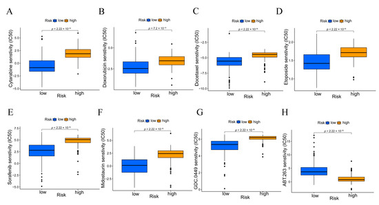The IC50 of four commonly used chemotherapeutic agents (cytarabine, doxorubicin, docetaxel, and etoposide) and four inhibitors (sorafenib, midostaurin, GDC-0449, and ABT-263) in high- and low-risk AML patients were predicted by using the pRRophetic algorithm. It was found that all the four chemotherapeutic drugs had remarkably higher IC50 in the high-risk patients (Figure 9A–D). The two inhibitors sorafenib and midostaurin which are beneficial for AML patients with the FLT3 mutations, both showed significantly higher IC50 in the high-risk group (Figure 9E,F), and the hedgehog inhibitor GDC-0449 (Vismodegib) also exhibited remarkably elevated IC50 in the high-risk group (Figure 9G), while the BCL-2 inhibitor ABT-263 showed significantly lower IC50 in the high-risk group (Figure 9H). Moreover, the mRNA expression level of PTCH1, SMO, GLI2 and BCL2 were significantly elevated in the high-risk group (Figure S2). The data suggests that the patients with low-risk scores had a more sensitive response to the traditional chemotherapy commonly applicated in AML therapy in a clinical setting. Low-risk patients may also be more sensitive to both sorafenib and midostaurin which are used for AML patients with FLT3 mutations, and to the hedgehog inhibitor vismodegib, but high-risk patients could be more sensitive to the BCL-2 inhibitor ABT-263.