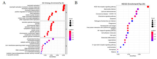 To further clarify the differences in the biological functions and pathways between the subgroups categorized by the risk model, enrichment analyses were performed based on the DEGs between the high-risk and the low-risk group in the TCGA-TARGET cohort by applying the criteria FDR < 0.05 and |log2FC| ≥ 1. A total of 853 DEGs were identified at first (Supplementary Data, Table S4). Among them, 66 genes were upregulated in the high-risk group, while the other 49 genes were downregulated (Supplementary Data, Table S4). Gene ontology (GO) enrichment analysis and Kyoto Encyclopaedia of Genes and Genomes (KEGG) pathway analysis were then performed. The results suggest that the DEGs were mainly enriched in the innate immune response, cytokine production chemokine signaling pathways, cell cycle, DNA replication and apoptosis (Figure 10A,B), which may provide indications for the poor survival and resistance to chemotherapeutic drugs in the high-risk subgroup.