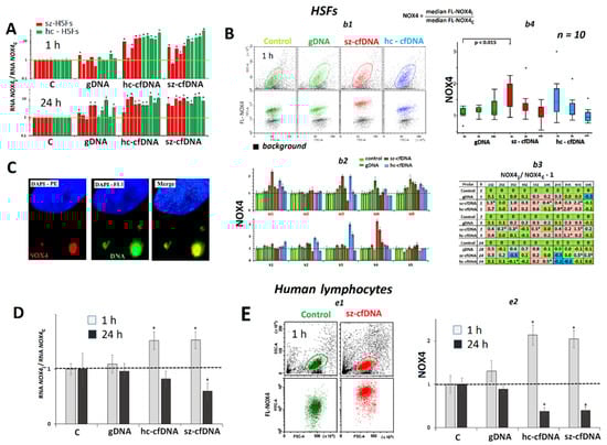 The exposure of HSFs and PBL to cfDNA (50 ng/mL) leads to the changes in NOX4 expression. (A). Change of the RNA NOX4 in HSFs in the presence of DNA samples. Average values for three measurements and standard deviation are given. The cultivation time and the DNA samples are indicated on the graph. The response to cfDNA differs from the control HSFs (p < 0.01). (B). b1—The most typical examples of NOX4 assay with FCA in HSFs. The data from the device are given for sz-HSF3 (1 h). b2—Index NOX4: the values of the medians of FL-NOX4i, normalized to the control signal value. Average values for three measurements and standard deviation are given. b3—Analysis of relative changes in NOX4 levels in the presence of DNA samples compared to control. Figures indicate the ratio (NOX4 DNA sample—NOX4control)/NOX4control. Green color—no significant differences with the control (p > 0.01), red—increased RNA content in the presence of the DNA probe (p < 0.01) and blue—decreased RNA content (p < 0.01). (*) the response to sz-cfDNA differs from the response to hc-cfDNA for this HSF (p < 0.01). b4—Changes in the NOX4 index in sample of HSFs (n = 10). (C). Localization of the labeled DNA sample (green) and NOX4 (red) in HSFs. An example is given for the sz-HSF3 line (probe sz-cfDNA, 1 h). (D). Change of the RNA NOX4 in PBL in the presence of DNA samples (50 ng/mL). Average values for four lymphocyte samples and standard deviation are given. (E). e1—The most typical examples of the NOX4 analysis with FCA in lymphocytes. e2—Changes in the NOX4 index in sample of lymphocytes (n = 4).