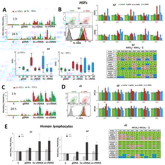 The influence of the DNA samples (50 ng/mL) on the expression of SOD1 and HIF1A genes in HSFs and PBL. (A). Change of the RNA SOD1 in HSFs. Average values for three measurements and standard deviation are given. The cultivation time and the DNA samples are indicated on the graph. The response to cfDNA differs from the control HSFs (p < 0.01). (B). b1—The most typical examples of the SOD1 assay with FCA in HSFs. The data from the device are given for sz-HSF3. b2—Index SOD1: the values of the medians of FL-NRF2i, normalized to the control signal value. Average values for three measurements and standard deviation are given. b3—Analysis of relative changes in SOD1 levels in the presence of DNA samples compared to control. Green color—no significant differences with the control (p > 0.01), red—increased RNA content in the presence of the DNA probe (p < 0.01) and blue—decreased RNA content (p < 0.01). b4—Changes in the SOD1 index in sample of sz-HSFs (n = 5) and hc-HSF(n = 5). (C). Change of the RNA HIF1A in HSFs. Average values for three measurements and standard deviation are given. The cultivation time and the DNA samples are indicated on the graph. (*) The response to cfDNA differs from the control HSFs (p < 0.01). (D). d1—The most typical examples of the HIF1A assay with FCA in HSFs. The data from the device are given for sz-HSF3. d2—Index HIF1A: the values of the medians of FL-NRF2i, normalized to the control signal value. Average values for three measurements and standard deviation are given. d3—Analysis of relative changes in HIF1A levels in the presence of DNA samples compared to control. Green color—no significant differences with the control (p > 0.01), red—increased RNA content in the presence of the DNA probe (p < 0.01) and blue—decreased RNA content (p < 0.01). (E). e1 and e2—Change of the RNA SOD1 and RNA HIV1A in the PBL in the presence of DNA samples (50 ng/mL). Average values for four lymphocyte samples and standard deviation are given.