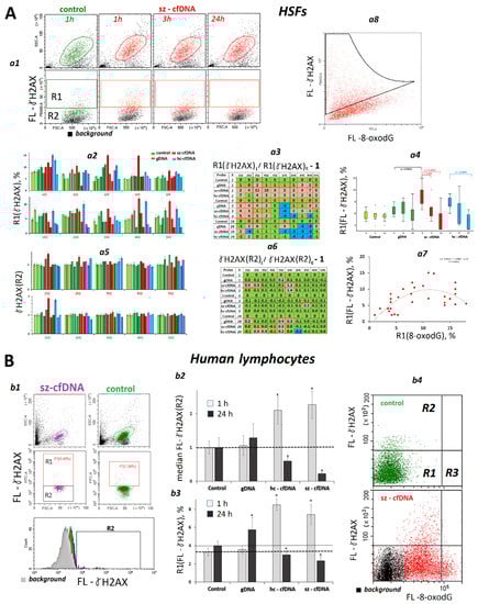 PBL. Hc-cfDNA and sz-cfDNA, but not gDNA samples, stimulated the growth of DNA damage in 1 h of cultivation. In 24 h, the content of the damage marker dropped back below the reference baseline (Figure 6Bb1–b3). The analysis of plot distribution in the FL-8-oxodG—FL-γH2AX curve has shown that, in the same way as HSFs, the peak content of the double-strand break marker can be found in cells with a relatively low content of the oxidation marker (Figure 6Bb4).