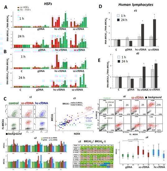 The influence of the DNA samples (50 ng/mL) on the expression of BRCA1 and BRCA2 genes in HSFs and PBL. (A,B). Change of the RNA BRCA1 and RNA BRCA2 levels. Average values for three measurements and standard deviation are given. The cultivation time and the DNA samples are indicated on the graph. (*) The response to cfDNA differs from the control HSFs (p < 0.01). (C). c1—The most typical examples (for sz-HSF1,1h) of the BRCA1 assay with FCA in HSFs. c2—Index BRCA1: the values of the ratio m(FL-BRCA1)i/m(FL-BRCA1c). Average values for three measurements and standard deviation are given. c3—Analysis of relative changes in BRCA1 levels in the presence of DNA samples compared to control. c4—Changes in the BRCA1 levels in sample of HSFs (n = 10). c5—Dependence of NOX4 index on BRCA1 index. c6—sz-HSF2 and hc-HSFs4 staining with two types of antibodies with different labels: NOX4 (PC5.5) and BRCA1 (FITC). (D,E). Change of the RNA BRCA1 and RNA BRCA2 in the PBL in the presence of DNA samples. Average values for four lymphocyte samples and standard deviation are given.