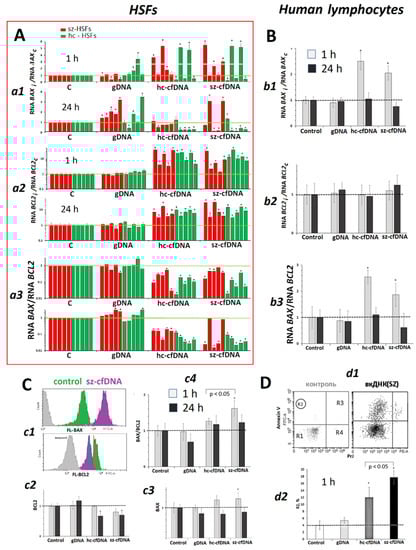 HSFs. Hc-cfDNA and sz-cfDNA samples stimulated expression of both BCL2 and BAX genes (Figure 8Aa1,a2). The intracellular amount of BCL2 RNA in 1 h of cultivation correlated with the amount of BAX RNA (Rs = +0.67, p < 0.0001, n = 40). A BAX RNA/BCL2 RNA ratio was significantly lower in the cells cultivated with hc-cfDNA and sz-cfDNA than in the reference samples and in the cells cultivated with gDNA (Figure 8Aa3). This finding may suggest a prevalence of antiapoptotic response in HSFs upon the exposure to hc-cfDNA and sz-cfDNA.