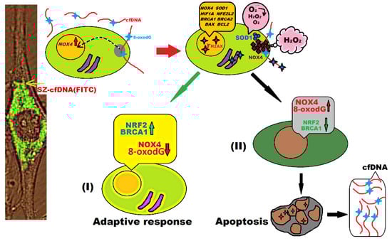 Thus, the investigation of a hypothetic adaptive response that HSFs and PBL develop to the actions of hc-cfDNA and sz-cfDNA fragments included the examination of pro- and anti-oxidative responses (changes in the NOX4, NFE2L2, SOD1 and HIF1A gene expression that is involved in ROS metabolism), antiapoptotic response (expression of BAX and BCL2 genes) and DNA damage response (DNA damage markers 8-oxodG and γH2AX, and expression of DNA repair genes BRCA1 and BRCA2). As a result of our study, we obtained one more confirmation of the hypothesis of the role of circulating cfDNA in the peripheral blood as an important bystander factor of the cell’s adaptive response to internal and external adverse impacts.