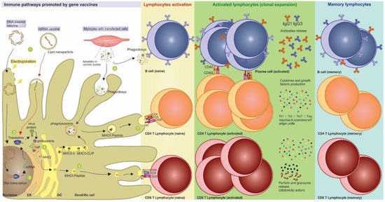 After translation, these intracellular antigens are processed inside the proteasome, generating the vaccine epitopes. Then, peptides are transported to the endoplasmic reticulum by the TAP transporter and are linked to MHC-I molecules to be presented to the T cell surface receptors and activate cytotoxic responses. Another pathway of immune response activation can occur from the production and secretion of vaccine antigens from transfected cells, like myocytes. These secreted products are phagocytized by antigen-presenting cells (APCs) and can activate helper responses when presented via MHC-II. The helper response is important because it allows the cross-activation of other cells in the immune system, such as B and TCD8 lymphocytes [13]. More details concerning the activation of immunological pathways by gene-based vaccines are in Figure 1.