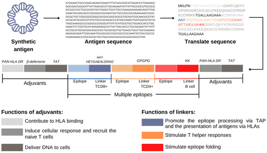 Another approach is the addition of spacer sequences between the epitopes [44]. Such sequences are known as linkers and have been specially engineered to offer proteasomal and lysosomal cleavage sites, as well as binding sites to the TAP transporter, thus increasing the efficiency of MHC pathway presentation. Some examples are the motifs HEYGAEALERAG, AAY, GPGPG, and KK (Figure 2) [30,34,45,46].