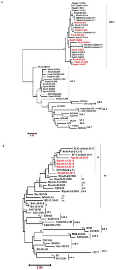 - Al-Sharif, H.A.; El-Kafrawy, S.A.; Yousef, J.M.; Kumosani, T.A.; Kamal, M.A.; Khathlan, N.A.; Kaki, R.M.; Alnajjar, A.A.; Azhar, E.I. Dominance of the ON1 Genotype of RSV-A and BA9 Genotype of RSV-B in Respiratory Cases from Jeddah, Saudi Arabia. Genes 2020, 11, 1323. [Google Scholar] [CrossRef] [PubMed]