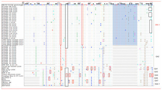 In the present study, genotype ON1 strains remained the dominant HOPV-A genotype in two epidemic seasons (2019/2020 and 2021/2022). These observations, are in parallel with our previous study where majority of HOPV-A strains were found to be that of ON-1 sub-genotype in Riyadh during winter seasons 2014/2015 and 2015/2016 [13]. An earlier study reported that 26% of the positive samples clustered in ON-1 sub-genotype in Riyadh between October and December, 2014 [30]. A recent study reported that 97% of HOPV-A sequences (n = 28) clustered into ON1 genotype in Riyadh, during 2016 [31]. In a similar fashion, a recent study reported that all HOPV-A strains belonged to the ON-1 sub-genotype in Jeddah, Saudi Arabia [25]. The ON-1 was originally identified in 2010 in Ontario, Canada. ON1 is characterized by deletion of three consecutive nucleotides (852–854) and 72-nucleotides duplication at 2nd HVR of G protein gene. Such an insertion resulted 72-nt insertion in G, resulting in 24 extra Aas, of which 23 are duplications of 261 to 283 [17]. ON-1 has replaced the previously predominant NA1 genotype and is reported to be rapidly spreading in many countries (e.g., Germany, Italy, and South Korea Malaysia, India, South Africa, Japan, China, and Kenya) [18,19,20,21,22].