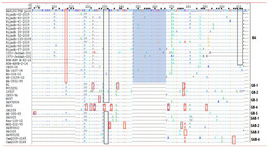 The insertion of AA in 2nd HVR of the G protein of HOPV resulted in a robust effect on the G protein in terms of functionality, glycosylation, and length. Analyzing the O-glycosylation sites at the C-terminal region of 2nd HVR of the G protein of Saudi strains showed (3–7) sites in the investigated HOPV-A sequences. The insertion of 24 AA in ON-1 sub-genotype led to addition of 11 new O-glycosylation sites (283S, 288T, 291S, 292T, 293T, 294S, 299S, 301S, 305T, and 306T) in the duplicated region, and 9 new O-glycosylation sites in BA sub-genotype (249S, 250T, 254T, 255T, 256T, 257S, 260T, 264T, 265S, and 266T). In contrast, the N-glycosylation sites of the ON-1 subgenotype or BA sub-genotype are limited, and duplication has no effect on the number of N-glycosylation sites. Variations in the N- and O-linked glycosylation of the G protein are an important landmark of antigenicity of the HOPV strains that may affect the expression of epitopes and contribute to immune evasion by either masking, facilitating, or influencing the antibody recognition [50].