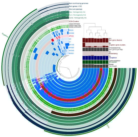 Pangenomic analysis of nine P. asiatica strains, generated by the Anvi’o. The ordering of the pangenome display was determined using Euclidean distances and Ward linkage settings. Beginning from the innermost ring and moving outward, rings 1 to 9 represent gene clusters identified in each of the P. asiatica genomes in the following order: 1, P. asiatica MY601; 2, P. asiatica MY545; 3, P. asiatica MY680; 4, P. asiatica MY756; 5, P. asiatica C1; 6, P. asiatica C3; 7, P. asiatica JP233; 8, P. asiatica MY660; and 9, P. asiatica RYU5. Rings 10 to 12 represents the location of known Clusters of Orthologous Genes (COG) categories, functions and pathways. Ring 13 highlights single-copy core gene clusters (SCGs). Rings 14 to 16 correspond to the combined, functional and geometric homogeneity index of each gene cluster. Rings 17 to 19 show the max number of paralogs, the number of genes within the identified gene clusters, and the number of contributing genomes. The histogram corresponds to number of gene clusters, number of singleton gene clusters, number of genes per kbp, genetic redundancy, completion, GC content, and total length for each P. asiatica genome present in the analysis. The dendrogram adjoining the histogram was constructed by gene cluster frequencies among the P. asiatica genomes.
