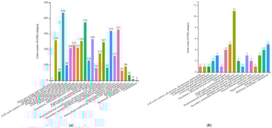 Based on GO annotation, 3809 genes were assigned to functions with 1782, 3126 and 1765 genes involved in cellular components, molecular functions, and biological processes, respectively (Supplementary Materials: Figure S3). The biological process “regulation of transcription, DNA-templated” (116 genes, 3.05%), cellular component “integral component of membrane” (1000 genes, 26.25%), and molecular function “DNA binding” (398 genes, 10.45%) were the most frequently represented gene categories.