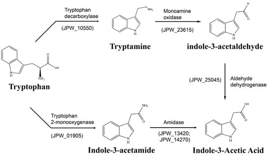 IAA is the predominant form of auxin in plants and plays important roles in promoting cell division, elongation and differentiation during plant growth and development [42]. Many plant-associated microbes have the ability to synthesize IAA, and JP233 was shown to produce IAA in our previous metabolomics analysis [15]. At least two putative tryptophan-dependent IAA biosynthetic pathways were found in the JP233 genome, including the indole-3-acetamide (IAM) and the tryptamine (TAM) pathways (Figure 6). In the IAM pathway, tryptophan 2-mono-oxygenase (jpw_01905) is responsible for converting tryptophan to IAM, and amidase (jpw_13420 and jpw_14270) catalyzes the formation of IAA from IAM. In the TAM pathway, tryptophan is converted to TAM by the tryptophan decarboxylase (jpw_10550), and TAM is converted to indole-3-acetaldehyde (IAAld) by monoamine oxidase (jpw_23615). An aldehyde dehydrogenase (jpw_25045) then catalyzes the formation of IAA from IAAld. Regarding the secretion of IAA, three genes (jpw_04700, jpw_13635 and jpw_14640) encoding putative auxin efflux carriers were found in the JP233 genome.