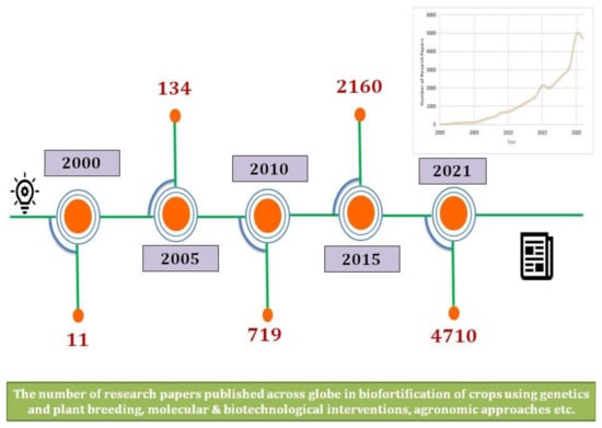 Biofortification is a sustainable strategy and harmonizing solution to malnutrition that involves breeding food crops for enhanced micronutrients with promising yields []. Research surroundingthe nutrition of food crops has become one of the primary research focuses in the last decade, as evidenced by the growing number of published articles on “biofortification” (Figure 1).