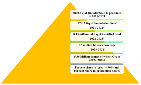 Targeted improvement for nutritional traits has led to the release or testing of 393 nutria-rich crop varieties in 63 nations across the globe and has been proved to be beneficial for 48 million populace []. Realizing the prominence of the nutritional quality of wheat, research efforts were streamlined to develop and release a series of biofortified varieties. These biofortified varieties were wellequipped to provide the required micronutrients for adequate growth and development. During 2021, 14 biofortified wheat varieties (less than five years old) were included in seed chains, and the highest breeder seed production was carried out in DBW187 (2315q) followed by HD8759 (420q) and DDW 47 (269.10q). During 2020–21, 14 biofortified wheat varieties contributed 19.54% (3334.60q of 17066.35q) of the total breeder seed indent, whereas 3890.60q of breeder seed of 14 biofortified varieties was produced for further multiplication (Table 5) [].