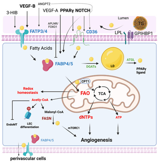 FATPs are trans-membrane-spanning proteins, which allow and enhance the uptake of LCFA into cells [32]. Compared with other FATPs, FATP3 is specifically expressed in the vasculature in muscular tissues [23], whereas FATP4 is expressed in endothelium and muscle and WAT [23]. Previous studies demonstrated that VEGF-B specifically controlled endothelial uptake of FA via transcriptional regulation of vascular FATP3 and FATP4 in muscle, heart, and BAT through VEGF receptor 1 and neuropilin 1 [23]. Dr. Arany’s group later identified 3-hydroxyisobutyrate (3-HIB), a catabolic intermediate of the branched-chain amino acid (BCAA) valine, promotes trans-endothelial fatty acid transport through FATP3 and FATP4, stimulates muscle fatty acid uptake in vivo and promotes lipid accumulation in muscle, leading to insulin resistance in mice [46]. Another study found that Angpt2 activated integrin α5β1 signaling in the endothelium and triggered fatty acid transport via CD36 and FATP3 into subcutaneous adipose tissue (SAT) [47]. Surprisingly, mitochondrial ATP has been demonstrated to control endothelial FA uptake via endoplasmic reticulum (ER)-FATP4 through its ATP-dependent acyl-CoA synthetase activity [48].
