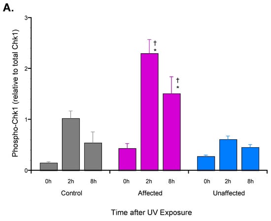 Therefore, the first portion of the present study was designed to examine the signal transduction pathway regulating the cell cycle response to UV exposure. Phosphorylation of the cell cycle checkpoint kinases 1 (Chk1) and 2 (Chk2) [30], substrates of the key DNA damage protein kinase sensors, ATR and ATM, respectively [29], was selected for this analysis. This comparison found significantly increased phospho-Chk1[S345] in protein extracts from the affected dFb compared with both the unaffected and control dFb following UV exposure (Figure 1), whereas no significant UV-induced phospho-Chk2[T68] was found in any of the dFb tested. Unexpectedly, this UV-induced increase in phospho-Chk1[S345] was found to potentially be reinforced by the previously observed UV-induced phospho-p53[S15] upregulation in the affected dFb [18], since it has been shown that phospho-p53[S15] may play a role in sustaining activated phospho-Chk1[S345] [33].