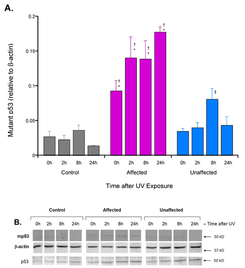 Mutant p53 (mp53) protein induction by dFb from affected LFS compared to unaffected or control subjects in response to UV exposure. Protein extracts of cultured dFb were subjected to immunoblot analysis following UV irradiation, as described. (A) Chemifluorescent signals corresponding to mp53 (53 kD) were normalized to those of β-actin (43 kD) following UV irradiation for each dFb source (n = 8: * p < 0.05 affected vs. unaffected dFb; † p < 0.05, affected vs. control dFb; ‡ p < 0.05 unaffected vs. control dFb). (B) Results from representative immunoblot.